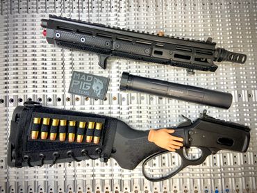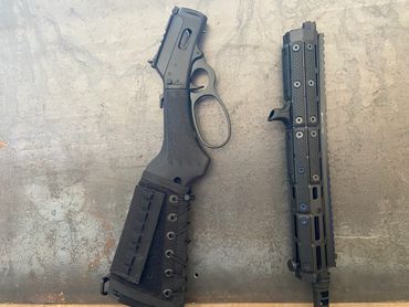 In 2020 we were contacted by well known Hollywood Armorer Rock Gallotti to build a rifle for the upcoming John Wick 4 film. We worked with a number of industry partners on a tight timeline to make these builds happen. They are Marlin(Remington made) 1894 Dark .44 Mag base rifles. We will not be making replicas of these to order, the reason why is that in 2023 we have far superior options for the parts available than existed in 2020 when we did these guns. These guns were also built for aesthetics to suit the film vs functionality of a hard use firearm. Mad Pig will be offering the Tracker Package in the future, which is a takedown variant of our Thumper V2A1 package in partnership with Wild West Guns.
